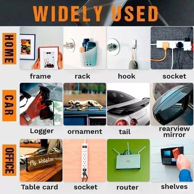 • COMPATIBLE WITH MANY SURFACES, INDOOR & OUTDOORS: Wood products, glass, metal, ceramic tile, leather, marble, plastic, etc... Can be used indoors and outdoors WITH TONS OF USES; car interiors, car phone holders, posters, plugs, routers, picture frames, pen holders, wall stickers, paintings, hooks, gadgets, sticky pads, mobile phone cases, decorative patches, and so much more!