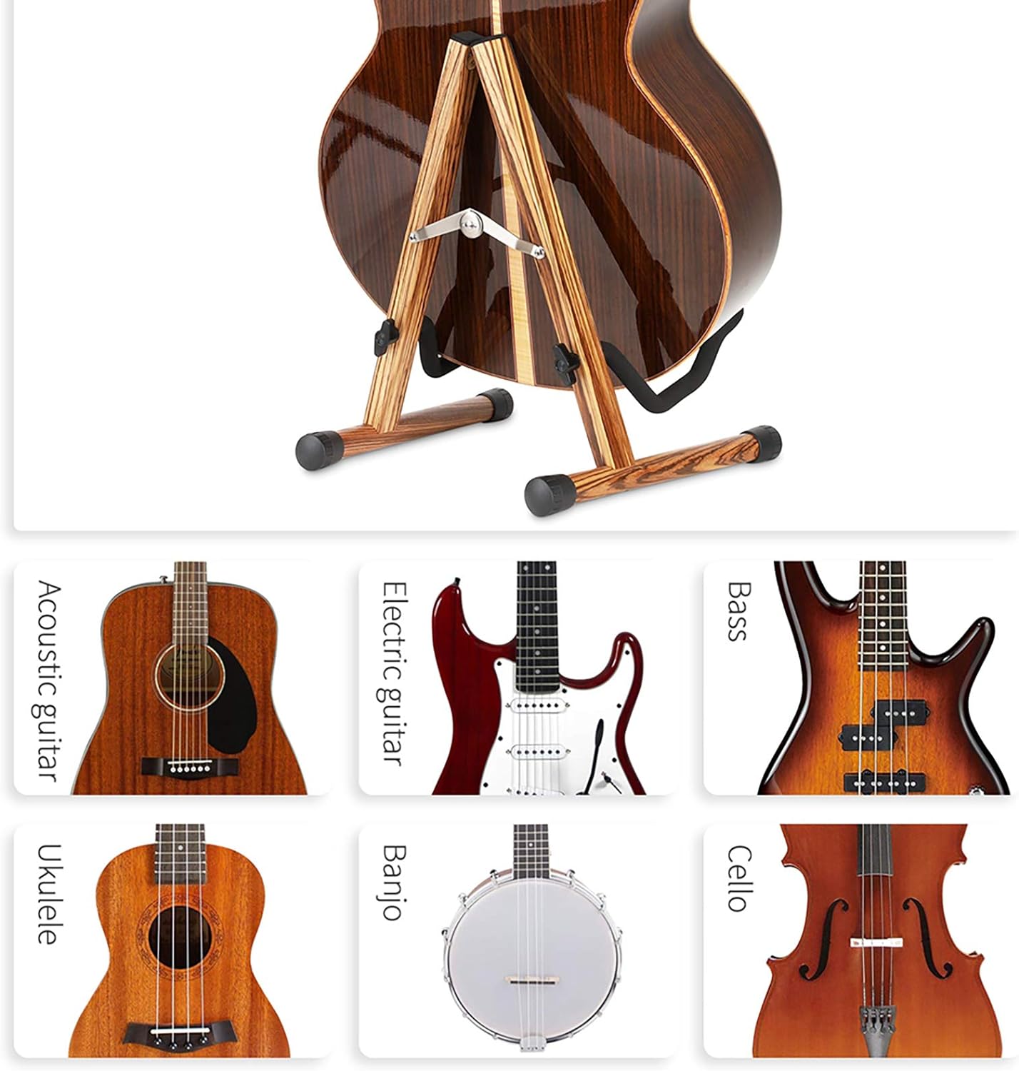 - 🎁Universal Wood Instrument Stand: The cradle arms of this A-Frame guitar stand could be adjusted in width range from 7" to 9" to easily accommodate multiple kinds of guitars and even other instruments. This basic guitar stand wood works like not only a full-size acoustic guitar stand, electric guitar stand, bass stand, ukulele stand but also as a cello stand (1/8-3/4 Cello), violin stand, banjo stand, french horn stand and more instruments.