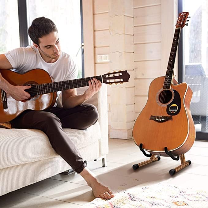 - 🎁Unique Classical Guitar Display Stands Floor: Made of solid Zingana Wood, this compact guitar holder stand brings an excellent hand feel rather than other metal stands. The minimalist acoustic guitar floor stand is a good piece of furniture for displaying a guitar at home. The smooth edges make you feel more classy and aesthetic and protect the surface of your favorite guitar from scratches, great to hold a guitar for displaying and picking the guitar up to practice any time.