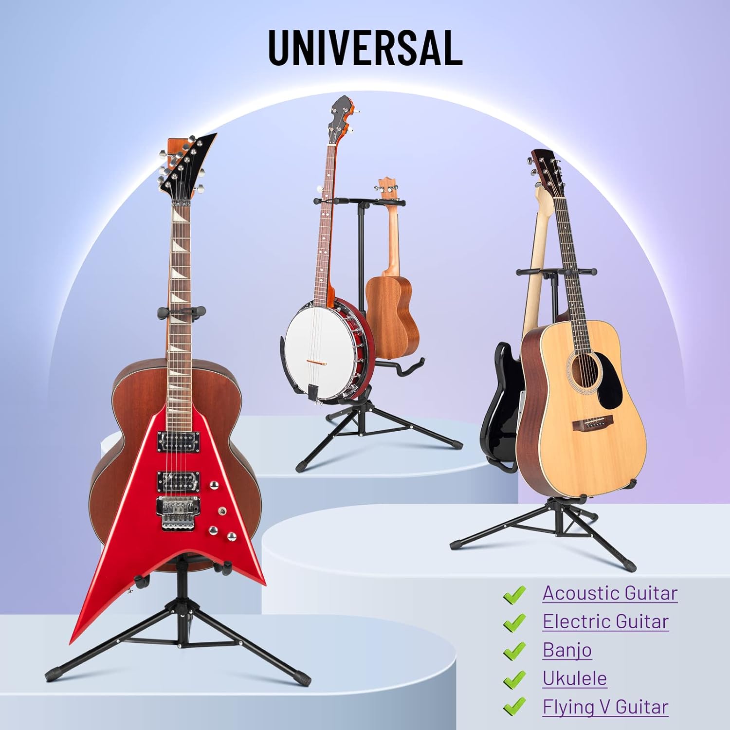 - Universal Guitar Stand: The cradle is fixed to the guitar stand with a knob. Suitable for various types of guitars such as acoustic, electric guitars, bass, 6 and 12 string guitars, banjo, mandolin, etc. In addition, the cradle is high off the ground, especially for accommodate non-symmetrical body guitars. Every great guitar deserves the best guitar stand!