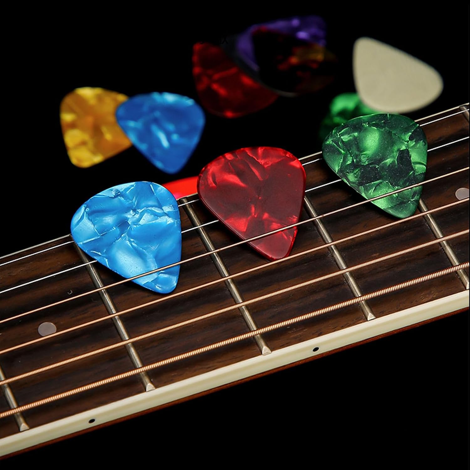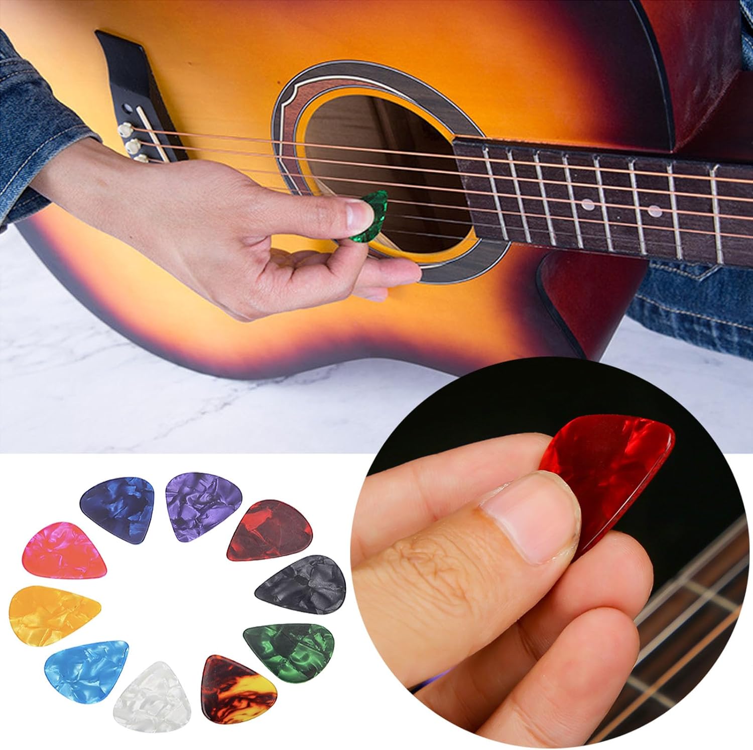- High Quality: High quality celluloid classic guitar picks provides a natural feel and warm tone for comfortable playing on electric, acoustic, bass guitar, banjo or ukulele. The variety of widths and differing flexibility will suit all styles of music and playing preferences.
