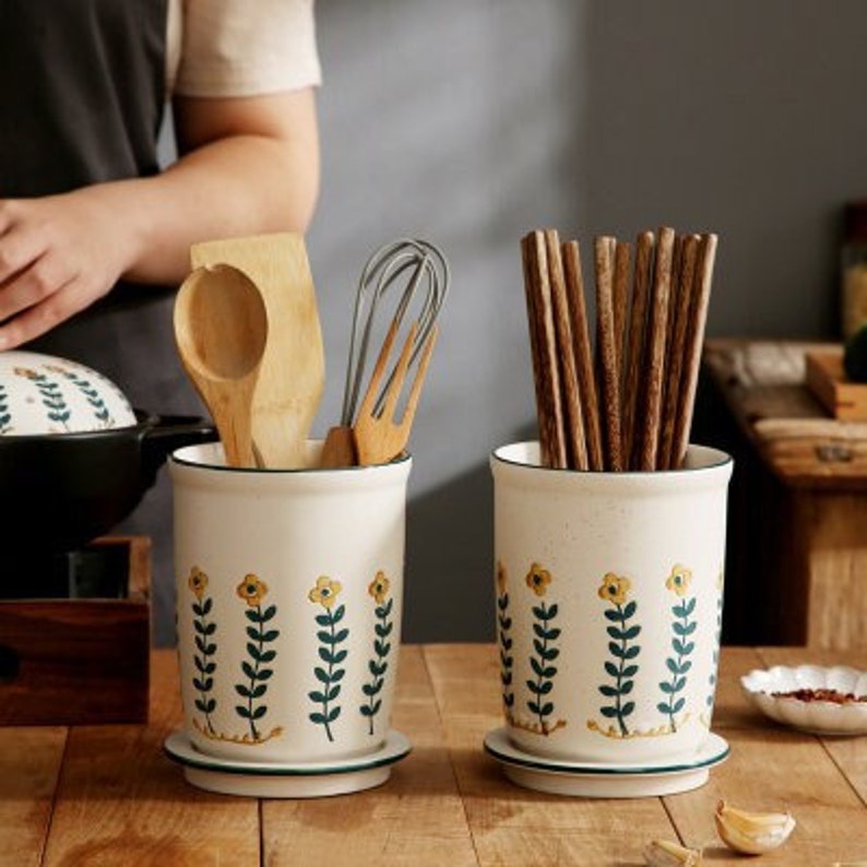 "There are small black spots on the small yellow flower cutlery tube. This is not a defect. This is a unique Japanese sesame glaze. The spout is drawn in dark and light strokes. The small yellow flowers are hand-painted, so there is no guarantee that every chopstick has the same pattern. Large capacity can accommodate more tableware, making your desktop more tidy, separate design, easy to clean with water, ceramic material, no mildew, no deformation, and a water filter hole at the bottom to avoid the growth of bacteria