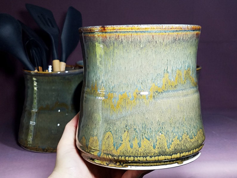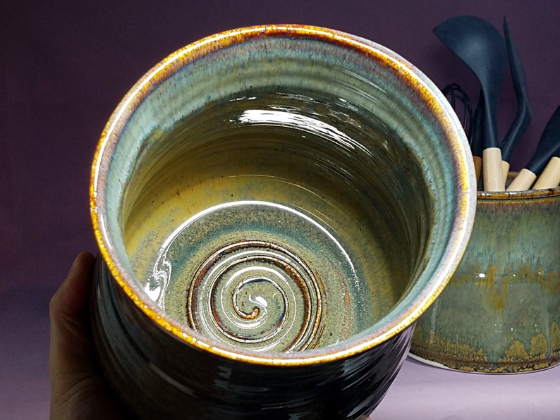 This handmade ceramic kitchen crock is all dressed up in my gorgeous glaze combination, "Thoreau's Pond." Lots of texture and movement in this glaze combo, and the unusual color combination seems to glow from within. Sturdy base that won't tip over. Plenty of room for lots of utensils! Beautiful on a kitchen counter or in an art room for your creative tools! Makes a wonderful housewarming, birthday, or Mother's Day gift.