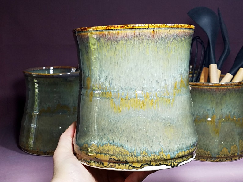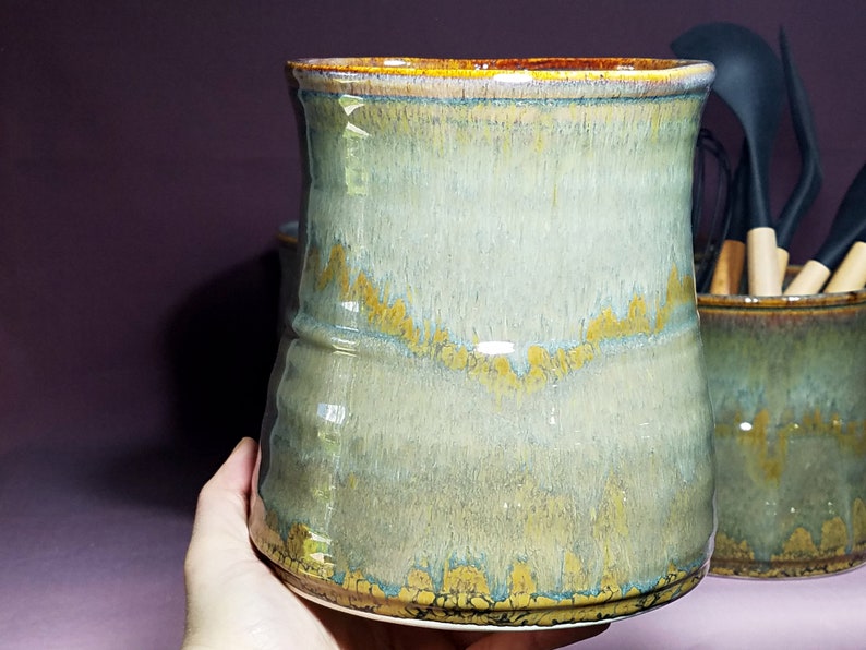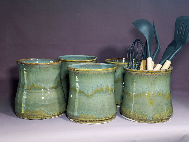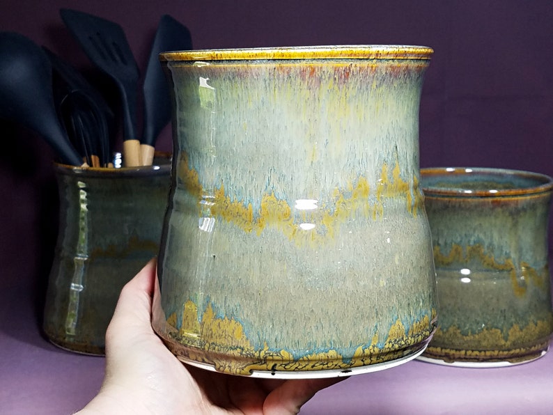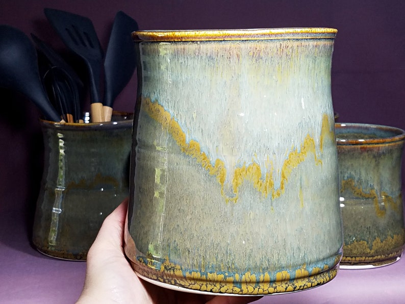 • Hand Thrown Pottery Utensil Holder, Ceramic Utensil Holder, Kitchen Caddy, Kitchen Crock, Utensil Crock, Handmade, Rustic, Each