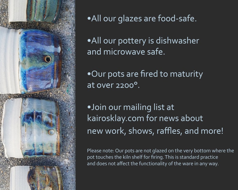 SAFETY: I've been using all my products in my own house daily for nearly ten years. My family tests each new product type I create before I list it in my shop, and I have a certification in ceramic product safety. All of my glazes are free from lead, barium, and cadmium, and are tested for leaching and durability.