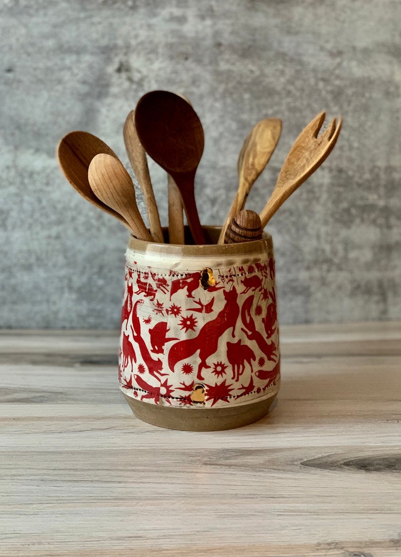 unique one of a kind kitchen utensil holder . It was handmade on my potters wheel from stoneware clay. glazed in a glossy roasted almonds .