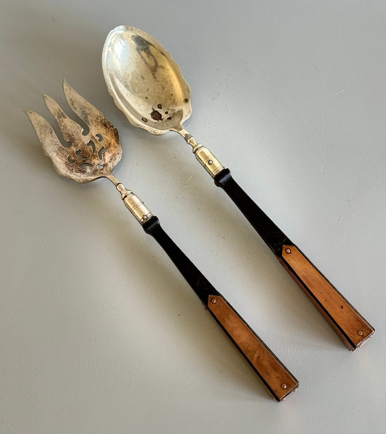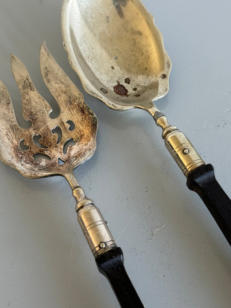 I especially love the contrast of the silverplate with the ebony wood handles. This is a rare style with the copper detailing on the handles.